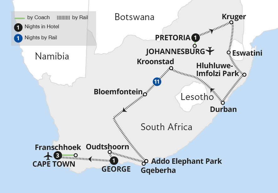 Join us on this sensational tour of Southern Africa, from the glorious Victoria Falls to the multicultural city of Cape Town, with fantastic wildlife viewing in Botswana's Chobe National Park and Nambiti Reserve in Kwa-Zulu Natal. Added to these superb experiences, a rail journey from the city of Pretoria to the coastal metropolis of Durban on...