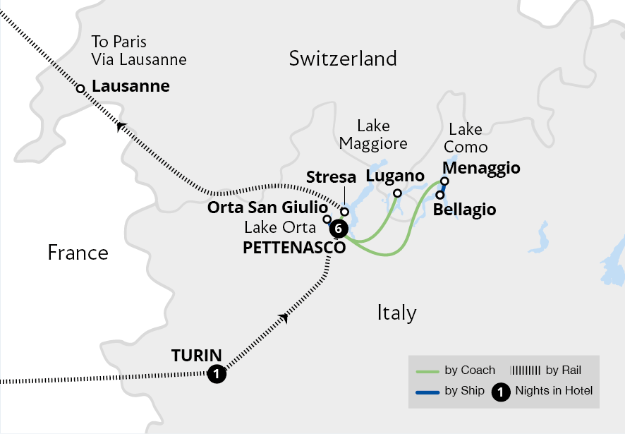 Explore the serene beauty of Italy's lakes from a base in the attractive town of Stresa, a haven for artists and writers over the centuries nestled on the shore of Lake Maggiore. Enjoy a cruise to an island monastery on Lake Orta and explore the lakeside village of Orta San Giulio. Journey through the Alps to Switzerland on the Centovalli...