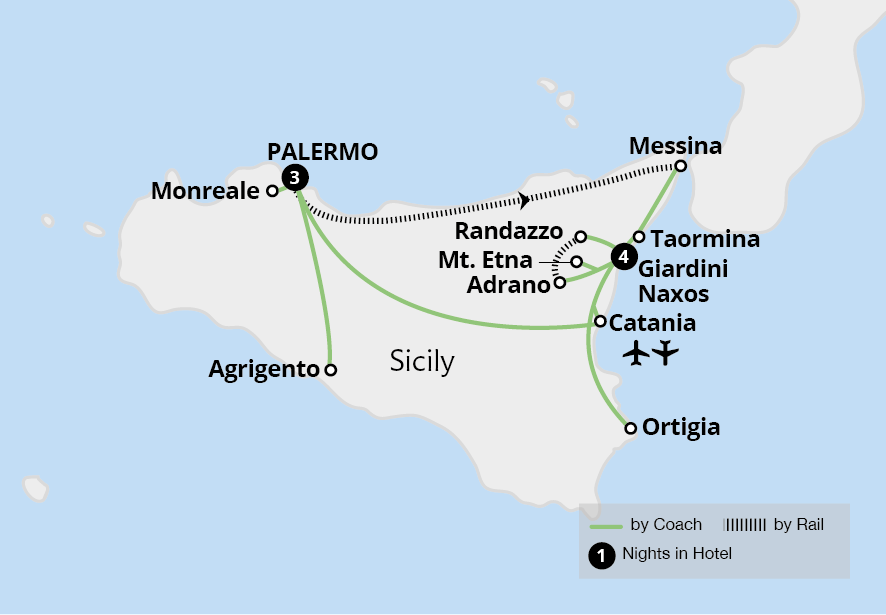 Fly to and from Catania to uncover the charms of Sicily from bases in cosmopolitan Palermo and the laid-back coastal resort of Giardini Naxos. Discover the historic towns of Monreale and Syracuse, whose architecture showcases the history and cultural influences of Sicily. Explore the Valley of the Temples and Taormina's Greek theatre. Visit...