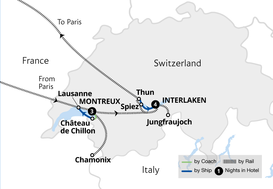 On this sensational holiday, travel from Montreux on the shores of Lake Geneva to the mountainous surroundings of the Jungfrau Massif. Explore Château de Chillon, sail on Lake Geneva and cross the Alps to the French mountain town of Chamonix on the Mont Blanc Express. Boarding the GoldenPass Express, admire views of the Bernese Alps...