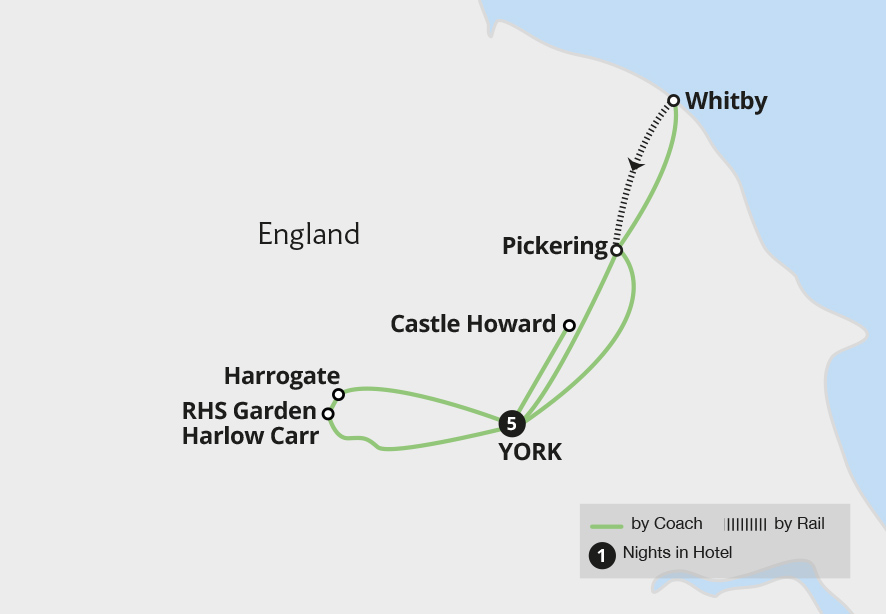 Encounter the untamed North York Moors and rolling Yorkshire Dales aboard the nostalgic North Yorkshire Moors Railway and famed Settle-Carlisle line, before discovering the gems of Northumberland on a tour which blends dramatic landscapes with fascinating history and culture. In Yorkshire, wander among the spectacular gardens of RHS Harlow ...