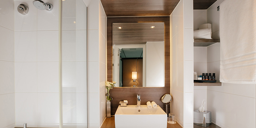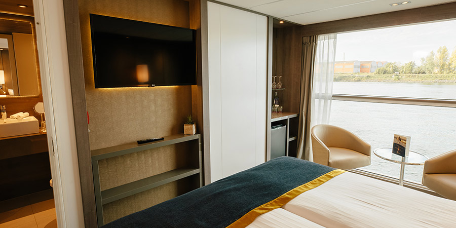 These en-suite cabins are stylish and impressively spacious at 17.5 squre metres, with a panoramic window balcony, walk-in wardrobe and seating area.