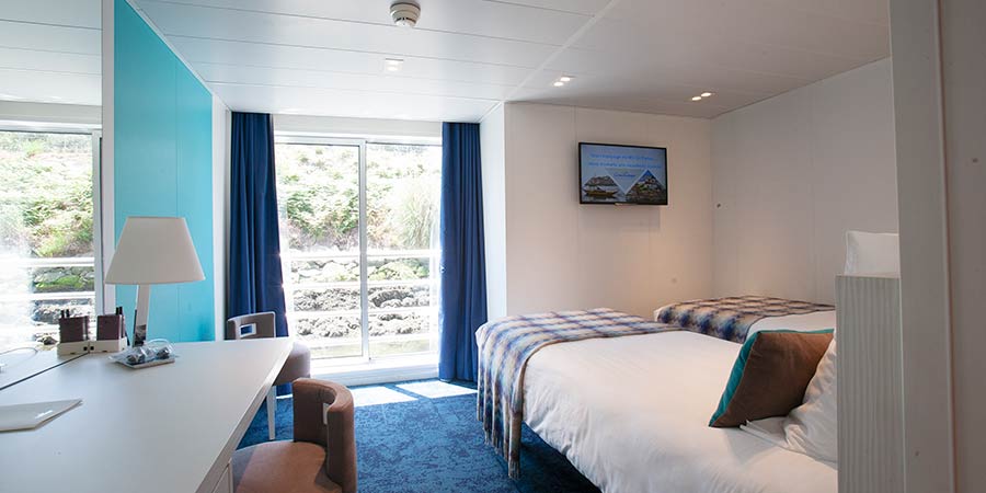 These cabins sit on the middle level of the ship and feature panoramic windows, a double bed, flat-screen television, individual climate control, an en-suite bathroom with shower and W.C, a hairdryer, direct dial telephone and in-room safe.