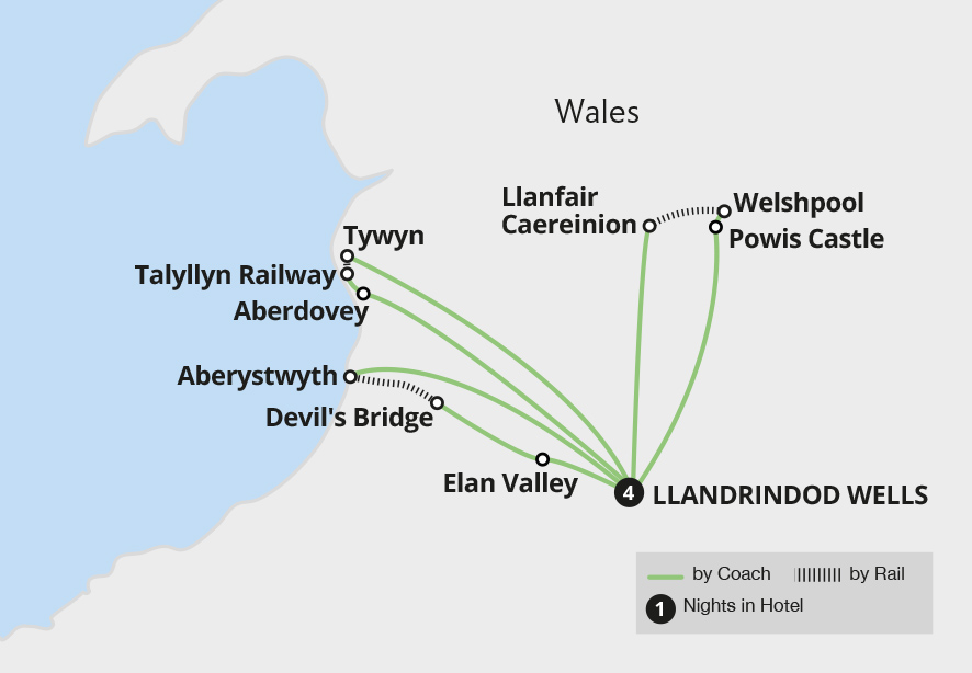 Journey on the nostalgic Vale of Rheidol, Talyllyn and Welsh & Llanfair railways and join a ranger on a private tour of the Elan Valley, also known as the 'Welsh Lake District'. Discover the renowned natural beauty of Aberdovey, stroll among the landscaped gardens of Powis Castle and enjoy an introduction to the Welsh language at the same school as King Charles III.